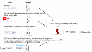 More than 8 million people worldwide are afflicted with type 1 diabetes (T1D), a disease that despite improved insulin treatment still results in a reduction of life expectancy by 12 years. The current model for T1D progression posits that in a subset of individuals with genetic susceptibility, the disease is precipitated by an as yet ill-defined triggering event. The nature of this triggering event remains a crucial open question in T1D. Viral infections have been extensively studied as precipitating events, but no causative viruses have been proven to date. Importantly, an anti-viral interferon response in recent onset T1D patients is well documented. However, this response can be activated not only by viral infection, but also by insufficient adenine to inosine editing of endogenous double stranded RNAs. Recent work from our team has shown that loss of adenine to inosine editing in mouse beta cells or in human islets causes sterile activation of a massive interferon response, and, in mice, beta cell destruction, while ablation of the critical editing enzyme from pancreatic alpha cells has no effect, supporting a unique susceptibility of beta cells to unedited double stranded RNAs. In addition, we demonstrated that genetic variants that reduce adenine to inosine editing in the human pancreas, so called editing quantitative trait loci or edQTLs, are associated with an increased interferon response and elevated risk of T1D. In this project, we are testing the hypothesis that the interferon response that characterizes early-stage T1D does not result from viral infection, but rather from insufficient editing of endogenous double stranded RNAs. We will evaluate three non-exclusive paths to a sterile IFN response in human islets. Firstly, we will test the impact of germline genetic variation on editing of cis transcripts. Secondly, we will build a dsRNA burden model to quantitively predict the amount of insufficiently edited dsRNAs as a trigger of the IFN response. Thirdly, we will determine if disruption of mRNA homeostasis via metabolic stress, ER stress, or abnormal splicing causes accumulation of double stranded RNAs that exceed the beta cell’s capacity for editing, thus resulting in activation of the interferon response. In sum, the proposed studies have the potential to lead to a paradigm shift in our understanding of the earliest events in the pathogenesis of T1D.